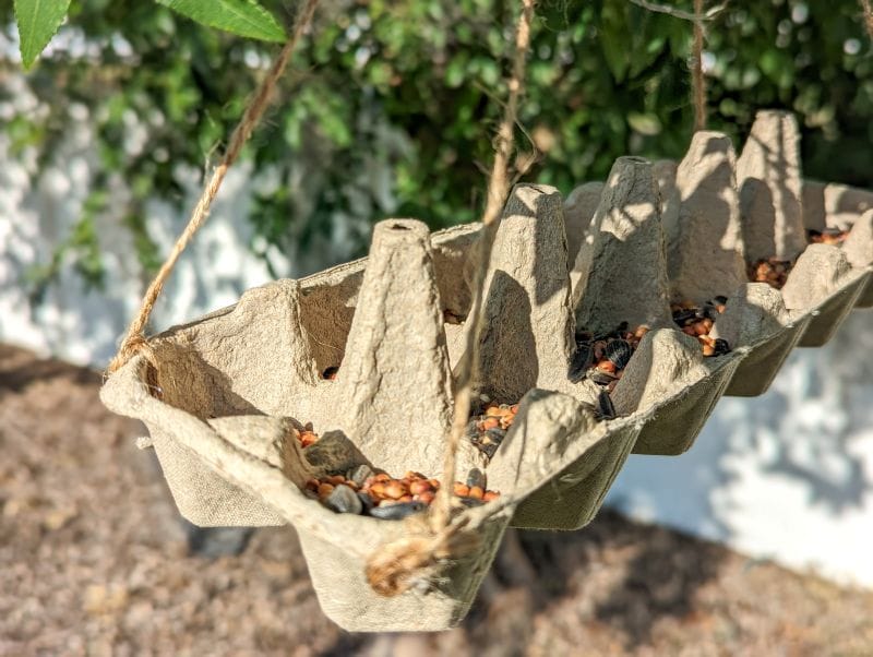 - Finally, add bird seeds, then hang the egg carton bird feeder on a tree in your